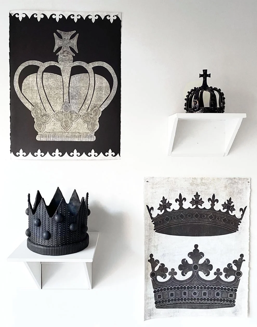 Almost Enlightenment: Royal crowns and Monoprints. A lexicon of royal motifs is used to explore larger issues of political power, decorative arts, and cultural migration. Using an intentionally limited palate of blacks, and a larger-than-life scale, the works move beyond literal renditions of jewels and precious metals to underscore nefarious narratives embodied in royal imagery. The porcelain crowns created during a Residency at Greenwich House Pottery, NY.